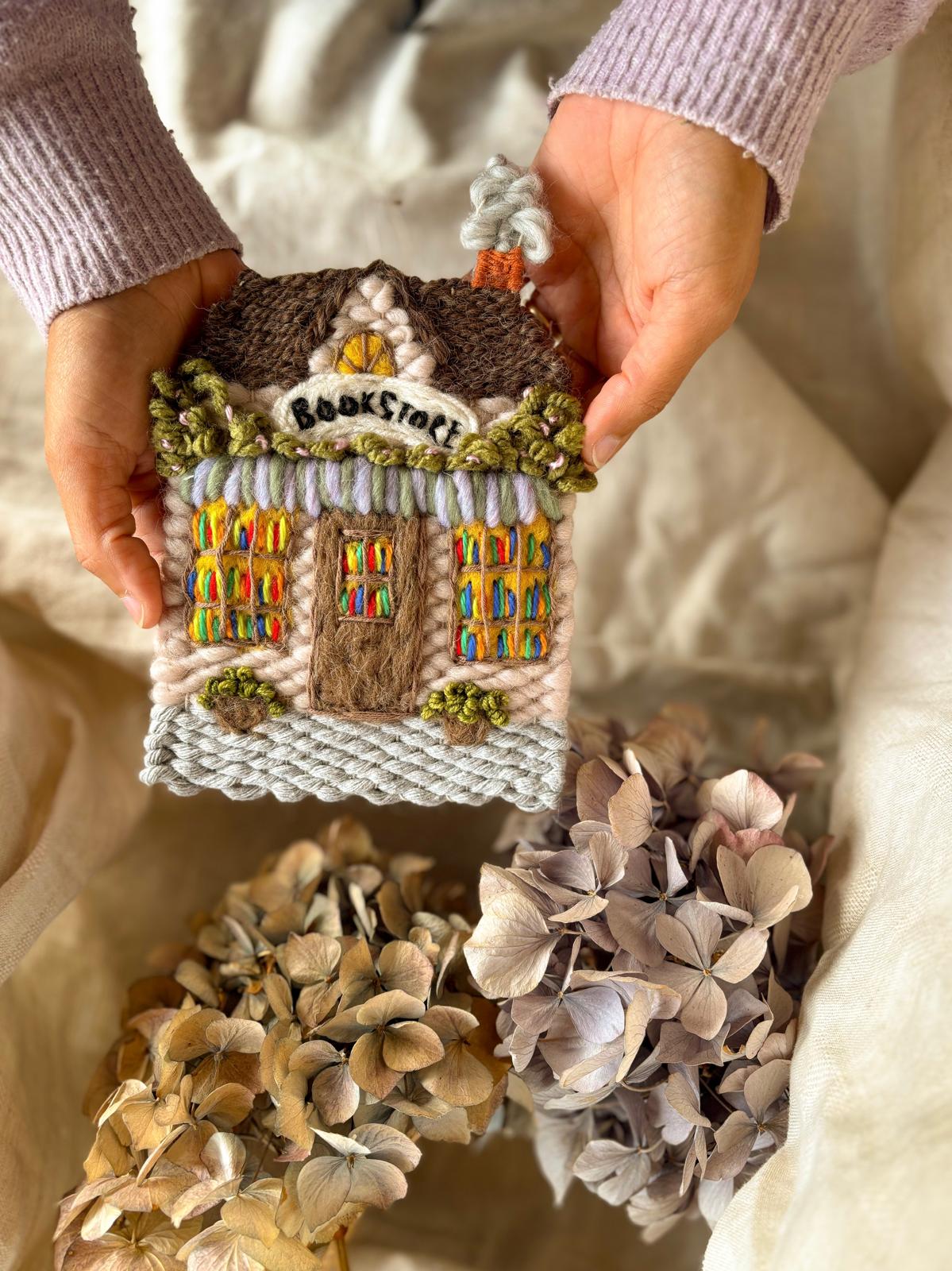 This textile house is a reliquary inspired by the architecture, culture, style of old bookstores. It is uniquely handmade through felting, weaving and sewing. It is a hanging piece that comes with a hook.