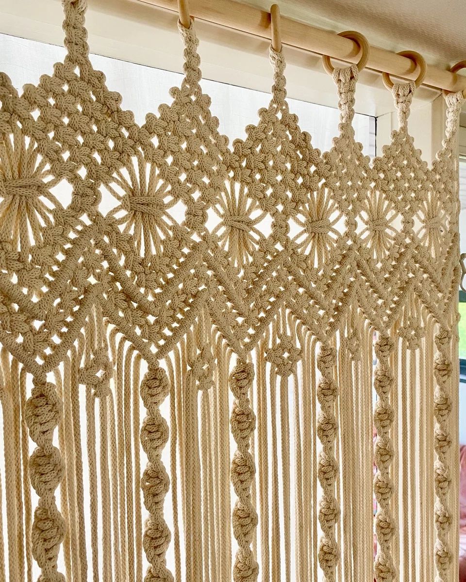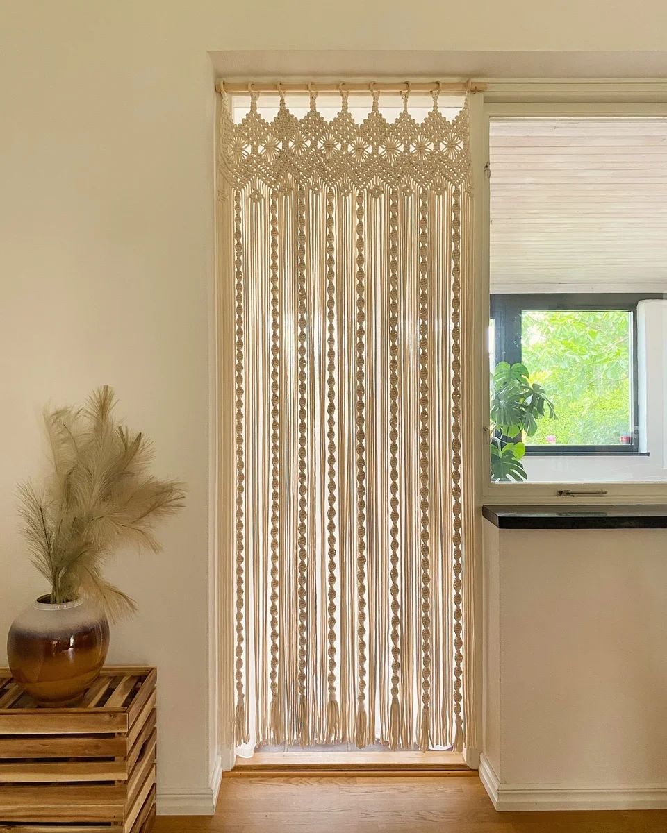 The curtain is adjustable to the curtain rod, as its weave is made using wooden rings. This piece does not release cotton residue, as it is made with braided cotton rope. It can be hand washed with neutral detergent.