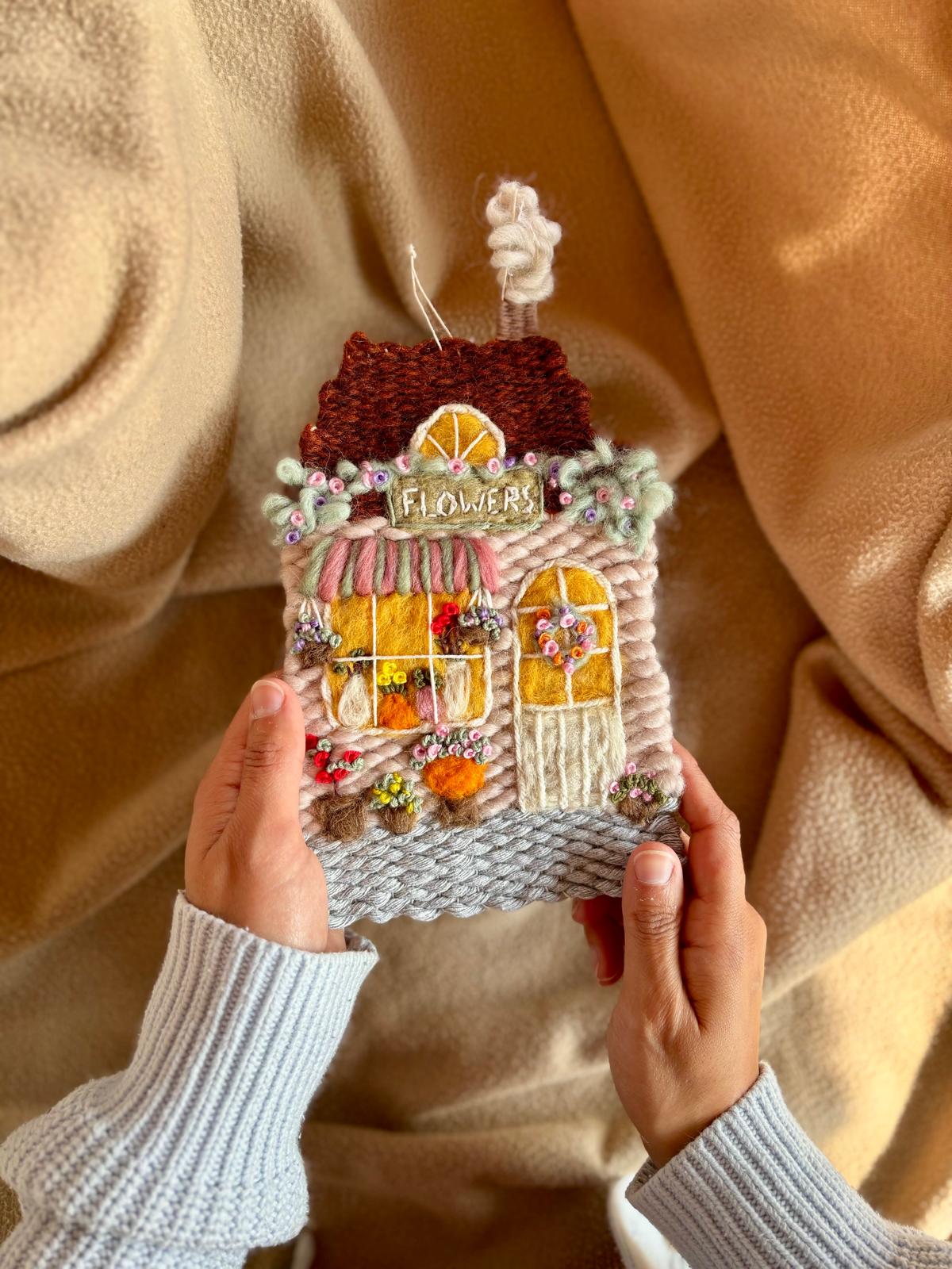 This textile house is a reliquary inspired by the architecture, culture, style of old flower shops. It is uniquely handmade through felting, weaving and sewing. It is a hanging piece that comes with a hook.